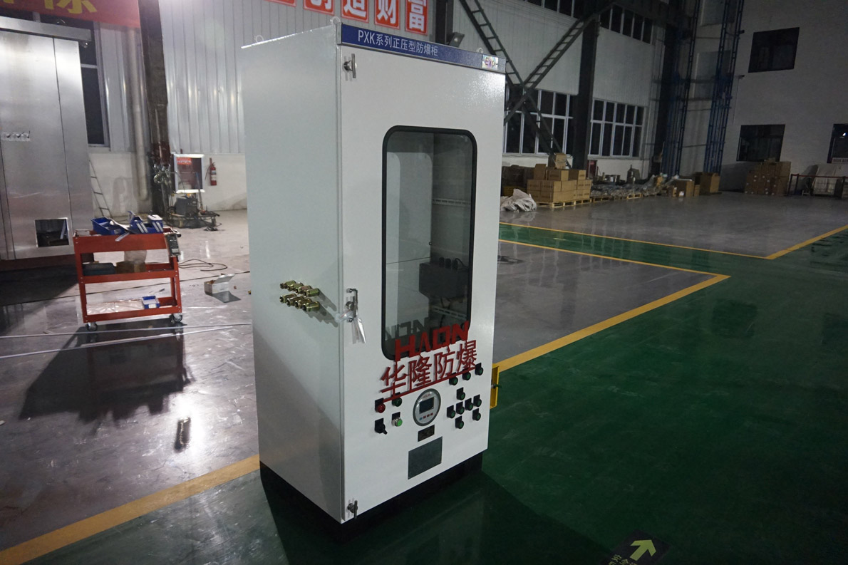 采用介質隔離點燃源的防爆措施。即:把用戶所用的電器元件安裝在一個充滿正壓潔凈氣體的柜體內,使外部環境中易燃易爆的混合性氣體無法接觸到電器元件在正常工作時所產生的電火花或危險溫度,從而達到電器防爆的目的。