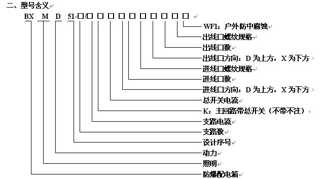 一、 適用范圍 1 . 1 區、 2 區危險場所。 2 . IIA 、 IIB 、 IIC 類,溫度組別為 T1-T4 的爆炸性氣體環境。 3 .適用于可燃性粉塵場所。 4 .戶內、戶外均可。 二、型號含義 三、 產品特